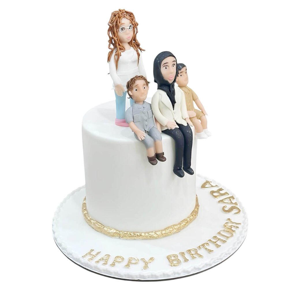 Celebrate with our Family Theme Cake, featuring a white frosting base and handcrafted fondant figures representing a loving family. The cake includes two adults and two children seated together, each with distinct outfits and hairstyles, capturing a warm and personal moment. A gold decorative band and personalized birthday message complete the elegant design. Order now for next-day delivery in Dubai, Sharjah, and Ajman.