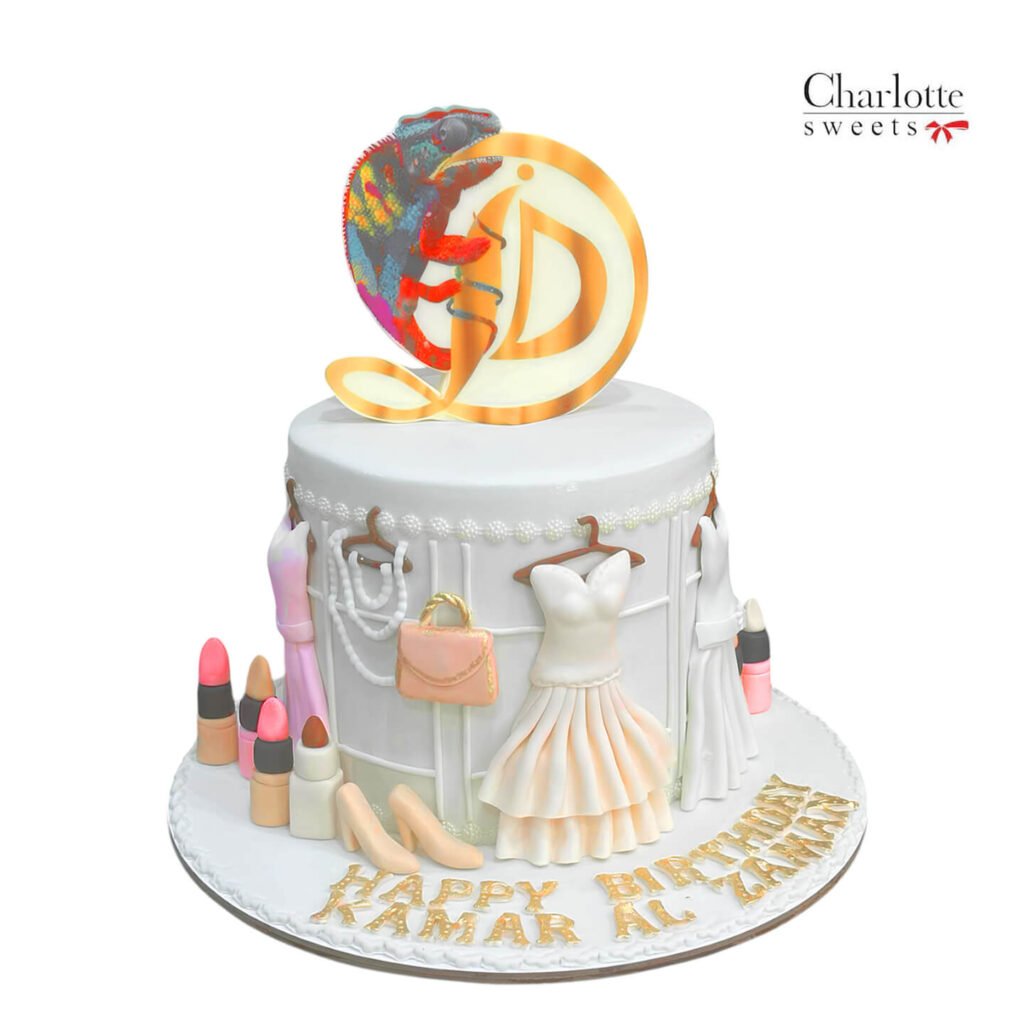 This unique and stylish cake is perfect for a fashion enthusiast! The cake features a whimsical chameleon perched atop a shimmering “D,” adding a touch of personality. The cake is further adorned with a charming display of clothing, accessories, and makeup, creating a glamorous and fashionable scene. The inscription “Happy Birthday Kamar Al Zaman” completes this personalized and impressive treat. Order online for next-day delivery in Dubai, Sharjah, and Ajman.