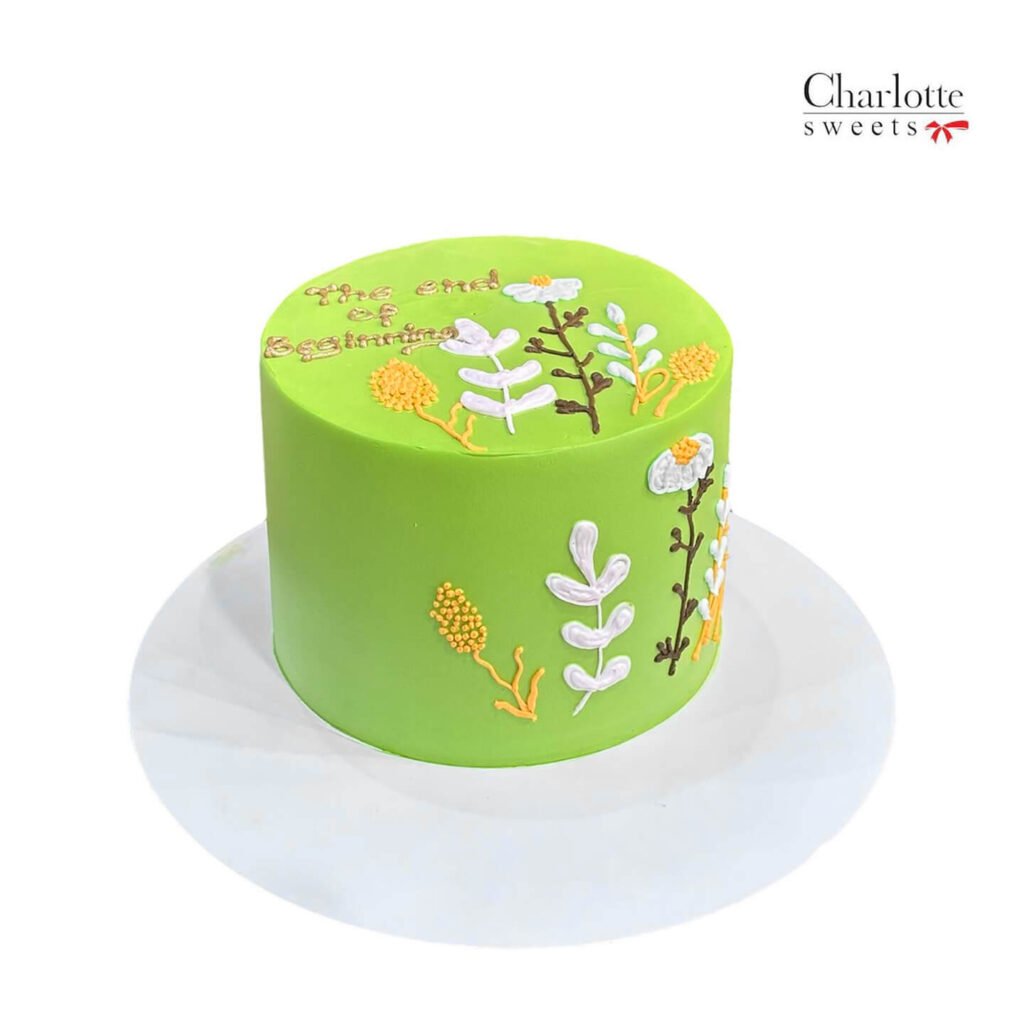 This refreshing green cake is the perfect way to celebrate a new beginning. Adorned with delicate floral embroidery and the inspiring message “The End is the Beginning,” this cake is both visually appealing and emotionally uplifting. Order online for next-day delivery in Dubai, Sharjah, and Ajman.