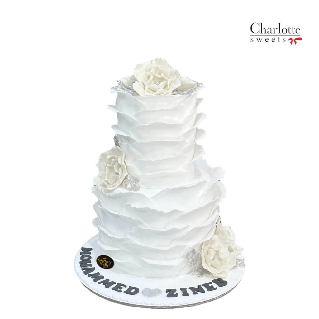 This stunning Two tier wedding cake is a masterpiece of elegance and sophistication. The pristine white tiers are adorned with delicate ruffles, creating a cascading effect that is both romantic and visually striking. The cake is further embellished with beautiful white flowers, adding a touch of natural beauty. The base features the names making it a truly personalized celebration of their union. Order online for next-day delivery in Dubai, Sharjah, and Ajman.
