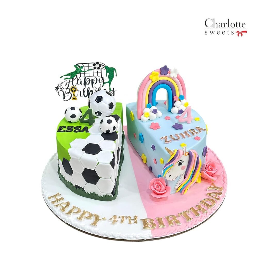 Dual Theme Birthday Cake | Football and Unicorn Design | Twins Birthday cake | Perfect for Shared Celebrations!