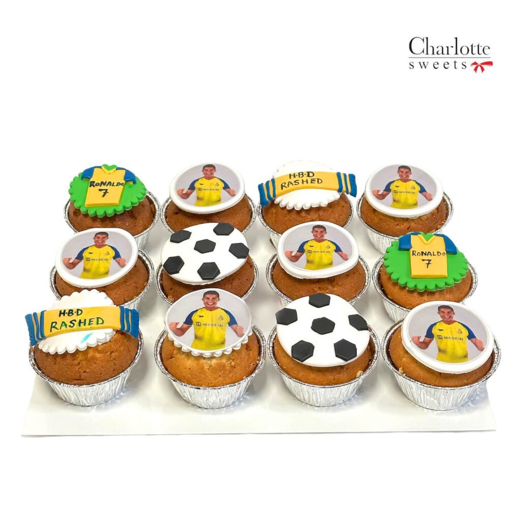 Celebrate a football fan’s birthday with this exciting cupcake set. Each cupcake is decorated with edible images of their favorite football player, Ronaldo, and football-themed toppers. Order online for next-day delivery in Dubai, Sharjah, and Ajman.