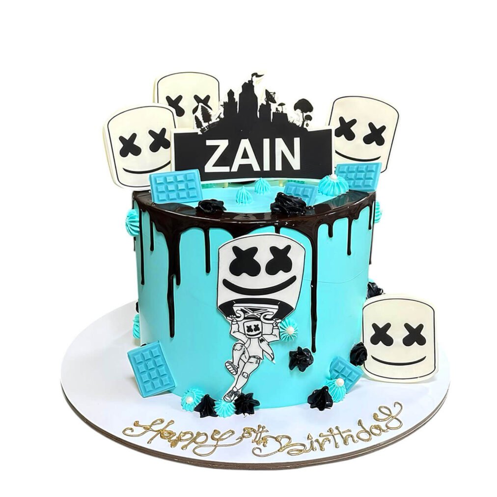 Marshmello Face Cake | Fortnite Cake Design | Blue & Black Gaming Style with Marshmello Elements & Custom Name Topper | Perfect for Kids’ Birthdays!