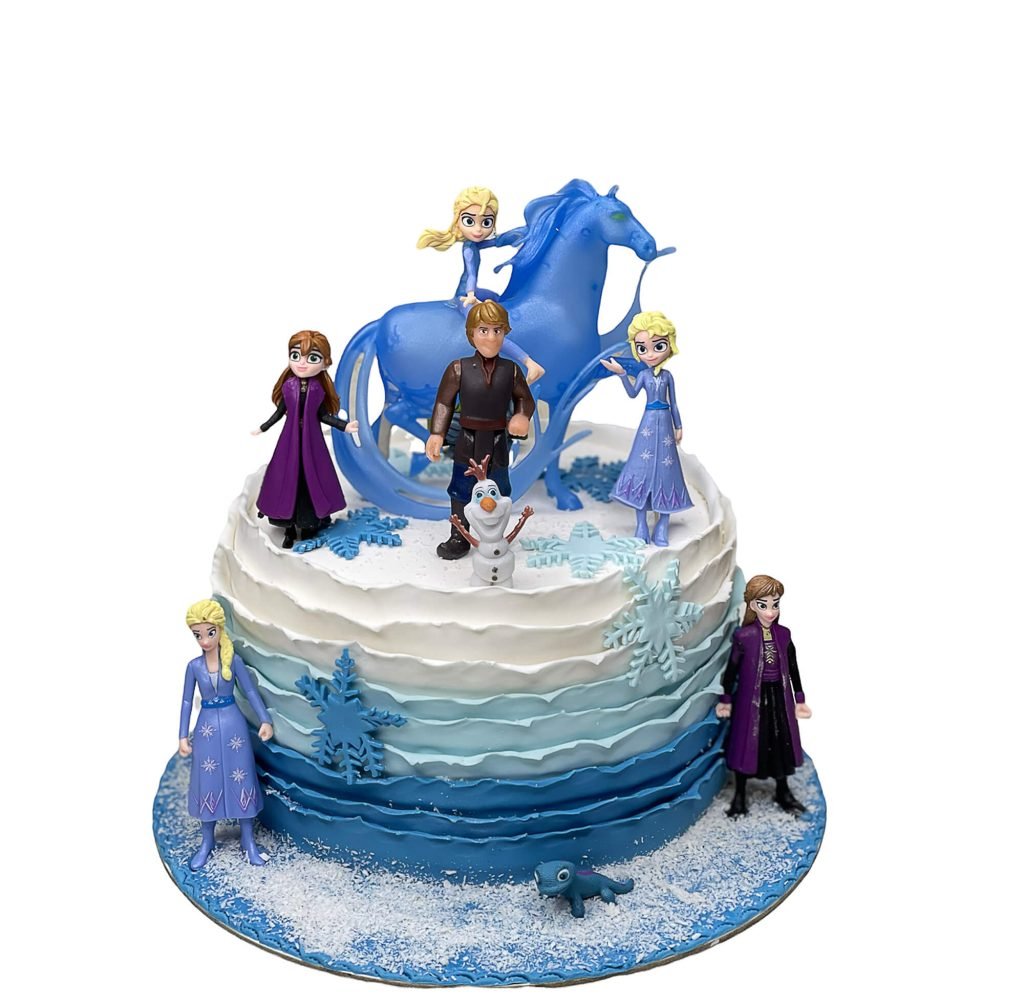 Let’s go with this Frozen cake! Featuring a beautiful blue and white design, the cake is adorned with popular characters from the beloved Disney movie, including Elsa, Anna, Kristoff, Olaf, Sven, and Hans. Perfect for any Frozen fan’s birthday celebration, this cake is sure to delight with its magical details.