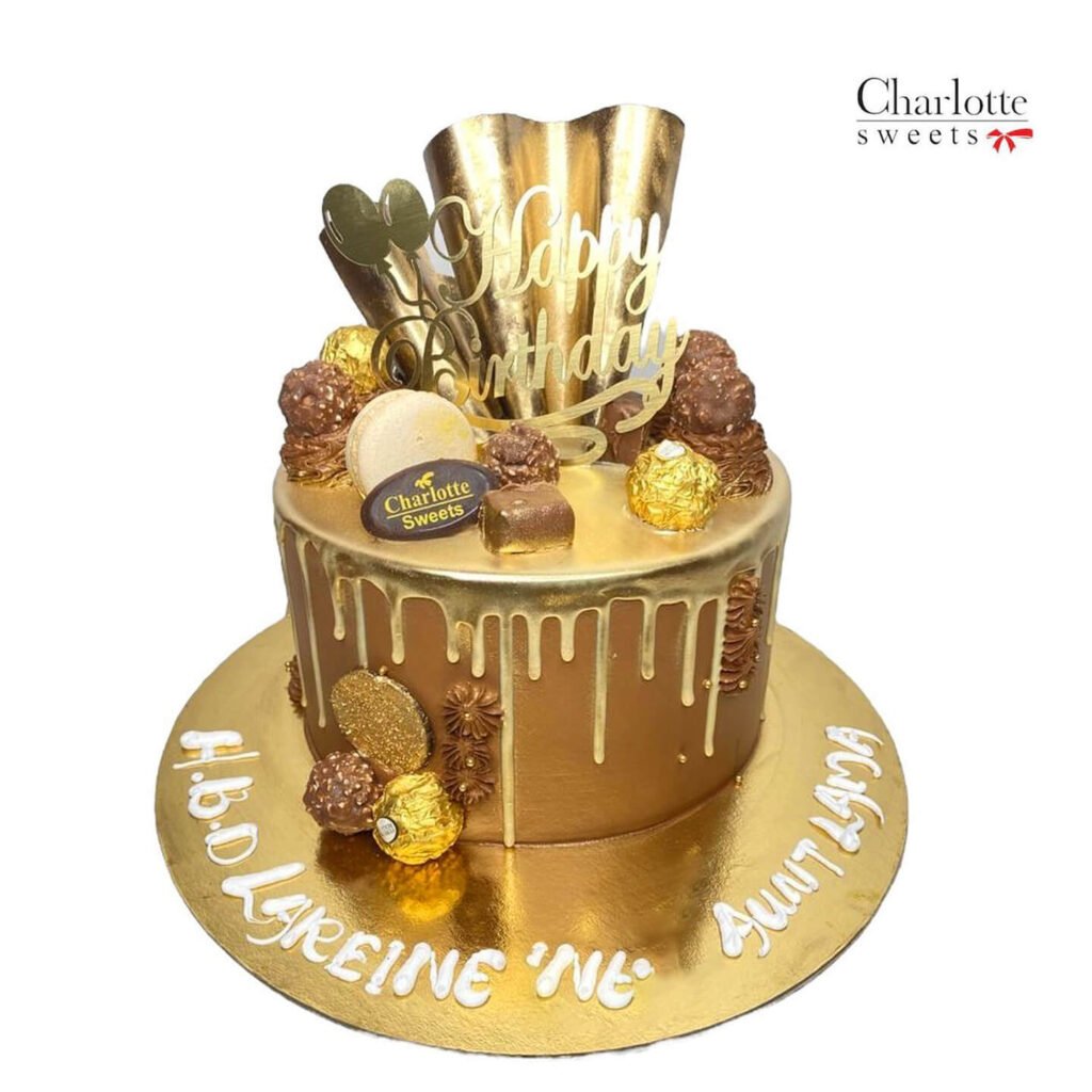 This luxurious cake is perfect for a special occasion. The golden drip cake is adorned with chocolate truffles, macarons, and a golden “Happy Birthday” topper. The personalized message adds a special touch. Order online for next-day delivery in Dubai, Sharjah, and Ajman.