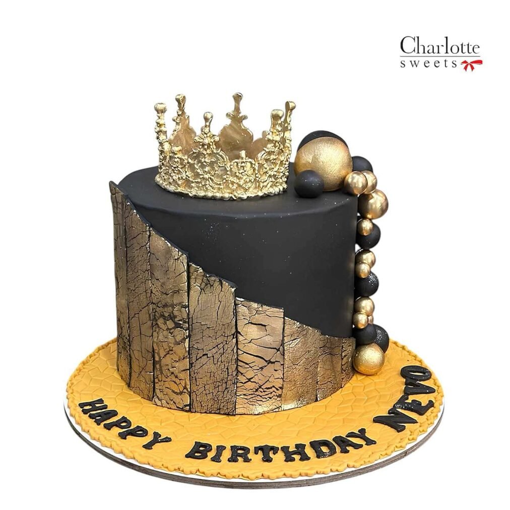 Celebrate with our Gold Crown Cake, featuring a stunning gold crown on top, with cascading gold and black spherical decorations. The cake has a textured golden design on one side, complemented by a sleek black surface. The base showcases the message “HAPPY BIRTHDAY NEYO” written in bold black letters. Order now for next-day delivery in Dubai, Sharjah, and Ajman.