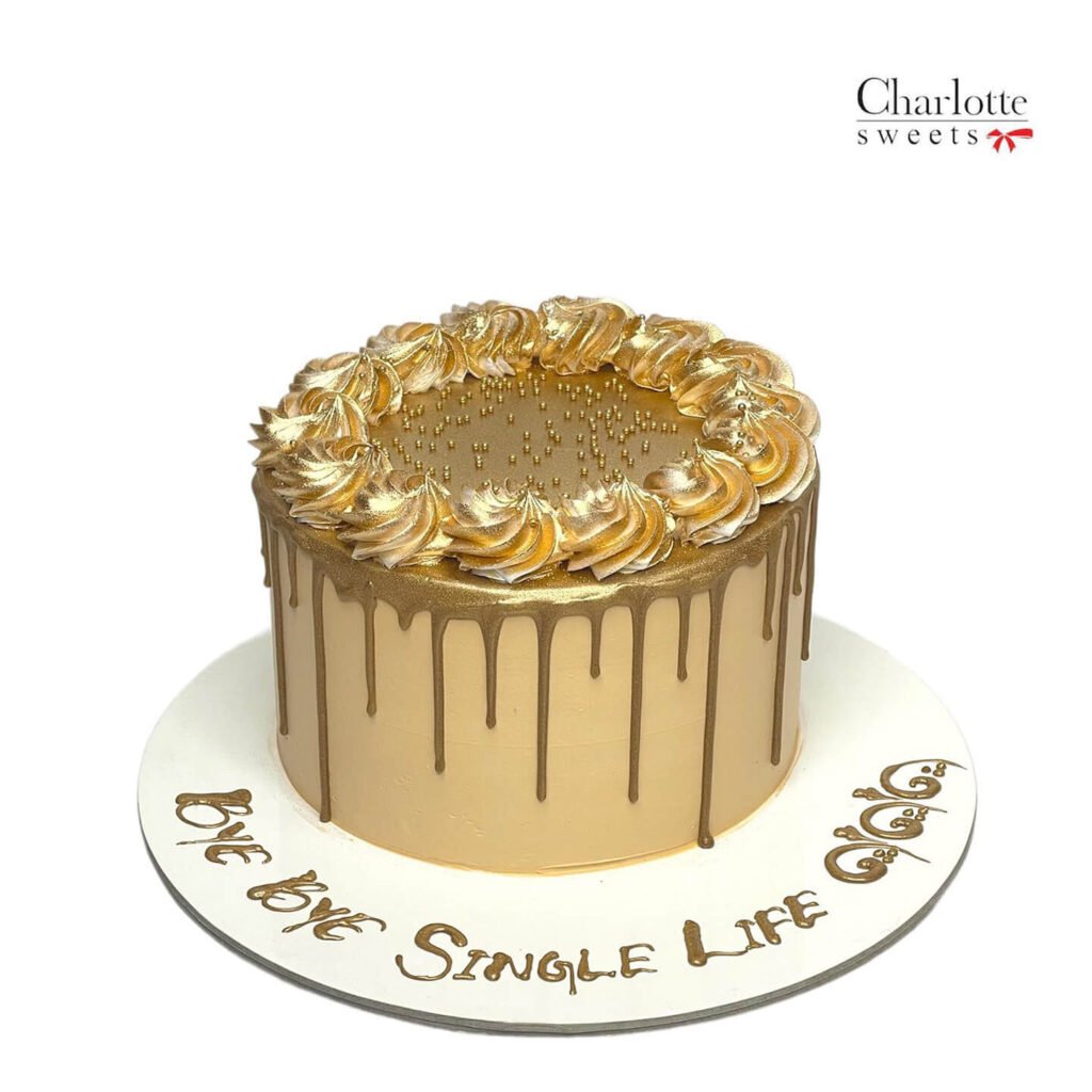 Celebrate a new chapter with this elegant “Bye Bye Single Life” cake! This single-tier cake features a sophisticated gold-toned base with a decadent chocolate drip. A ring of golden buttercream swirls encircles the top, adorned with delicate gold sprinkles. The cake board is inscribed with “BYE BYE SINGLE LIFE” making it a unique and memorable centerpiece for a pre-wedding celebration. Order online for next-day delivery in Dubai, Sharjah, and Ajman.