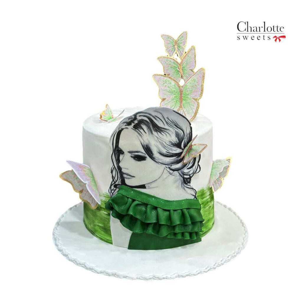 This stunning cake is perfect for an artist, dreamer, or anyone who appreciates beautiful things. The cake features a delicate portrait of a woman adorned with butterflies, creating a whimsical and artistic look. The green and white color scheme adds a touch of elegance. Order online for next-day delivery in Dubai, Sharjah, and Ajman.