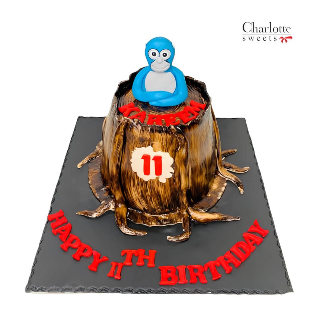 Celebrate your special occasion with this unique tree stump cake! This single-tier cake is designed to resemble a detailed tree stump, featuring textured bark and exposed roots, creating a rustic and natural look. A playful blue monkey sits atop the stump, adding a whimsical touch. A red “11” marks the special age. “HAPPY 11TH BIRTHDAY” is prominently displayed in red lettering on the cake board, making it a personalized and memorable centerpiece. This cake is a perfect blend of artistry and sweetness, ideal for a memorable celebration. Order online for next-day delivery in Dubai, Sharjah, and Ajman.