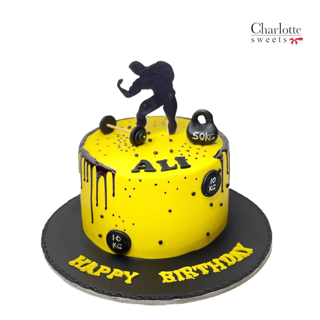 This unique and fun cake is perfect for a fitness enthusiast! The bright yellow cake is decorated with a dynamic silhouette of a bodybuilder, showcasing a powerful pose. The cake is further embellished with weight plates, a barbell, and a weightlifting chain, creating a fun and energetic atmosphere. The inscription “Happy Birthday Ali” adds a personal touch. Order online for next-day delivery in Dubai, Sharjah, and Ajman.
