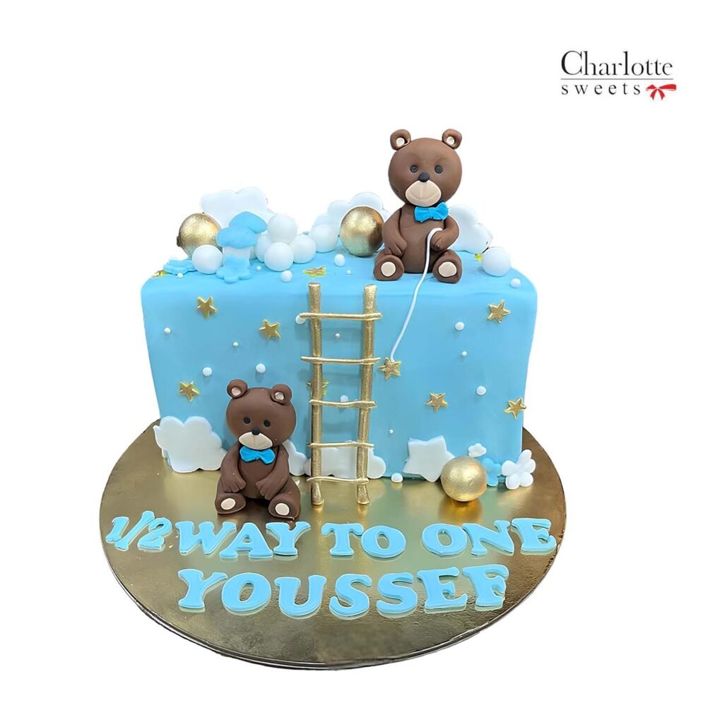 This is a square cake with a light blue fondant covering, featuring two fondant teddy bears, a golden ladder, and cloud and star decorations. The cake is set on a gold-colored base with the message “1/2 WAY TO ONE YOUSSEF” in blue lettering. Order online for next-day delivery in Dubai, Sharjah, and Ajman.