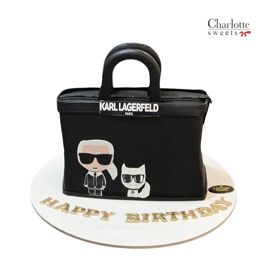 This stunning Karl Lagerfeld-inspired cake is the perfect gift for any fashion enthusiast. The cake is designed to resemble a luxurious handbag, complete with the iconic Karl Lagerfeld logo and signature sunglasses. The personalized message “Happy Birthday” adds a special touch. Order online for next-day delivery in Dubai, Sharjah, and Ajman.