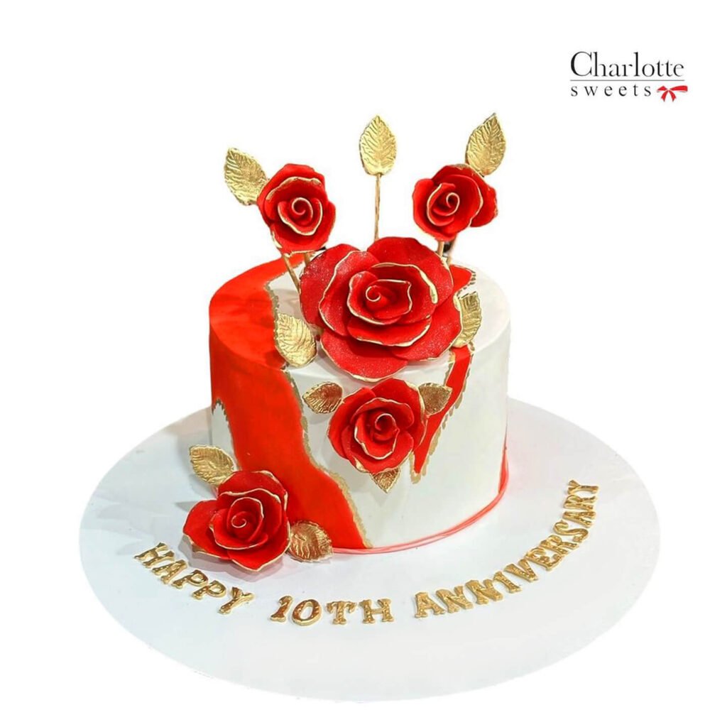 This elegant cake is the perfect way to commemorate a 10th wedding anniversary. The white and red color scheme, combined with delicate rose decorations and gold accents, creates a romantic and sophisticated look. The “Happy 10th Anniversary” message adds a special touch. Order online for next-day delivery in Dubai, Sharjah, and Ajman.