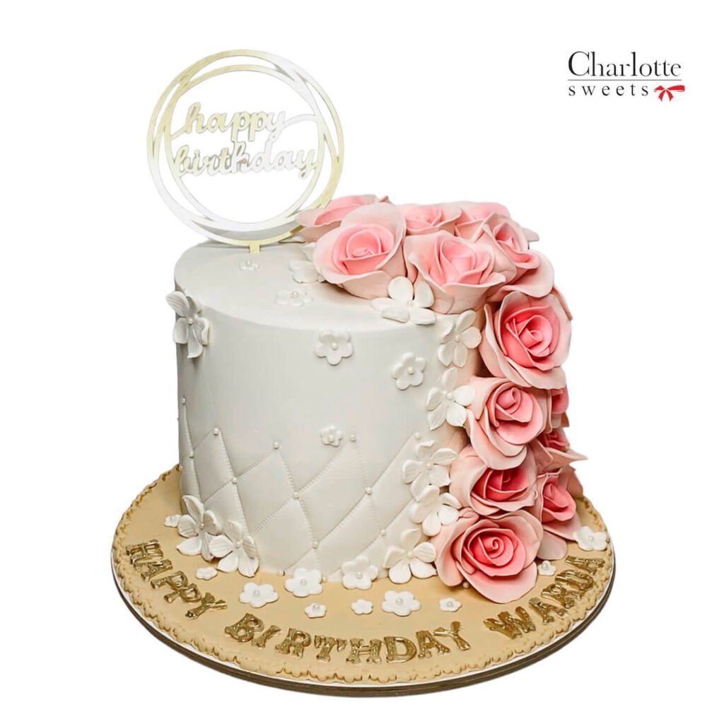 perfect for a birthday or any special occasion. A pristine white base is adorned with a cascading waterfall of delicate pink roses, creating a truly breathtaking sight. The quilted pattern adds a touch of sophistication, while the golden “Happy Birthday” message and elegant topper complete this exquisite creation. Order online for next-day delivery in Dubai, Sharjah, and Ajman.