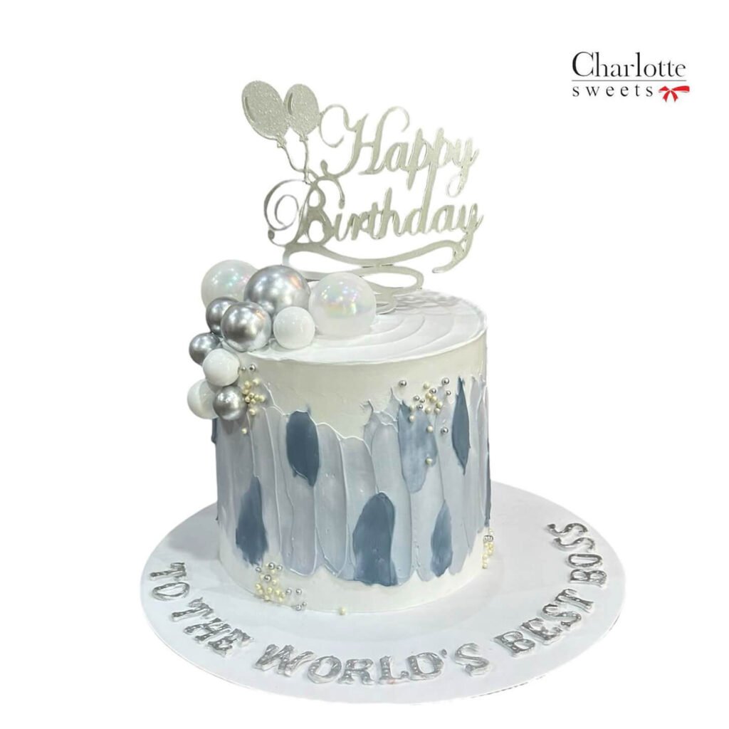 This elegant cake is perfect for a special birthday or any occasion that calls for a touch of sophistication. The sleek silver and blue color palette, combined with a textured finish and pearl accents, creates a modern and stylish look. The personalized message “To the World’s Best Boss” adds a special touch. Order online for next-day delivery in Dubai, Sharjah, and Ajman.