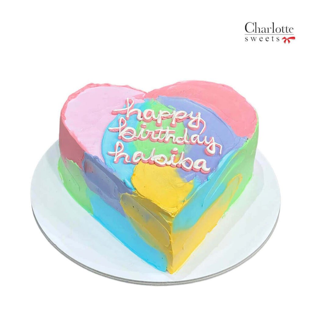 This vibrant and colorful heart-shaped cake is the perfect way to celebrate a special birthday. The cake is adorned with a beautiful swirl design in various pastel shades, creating a visually stunning and playful look. The personalized message adds a special touch. Order online for next-day delivery in Dubai, Sharjah, and Ajman.