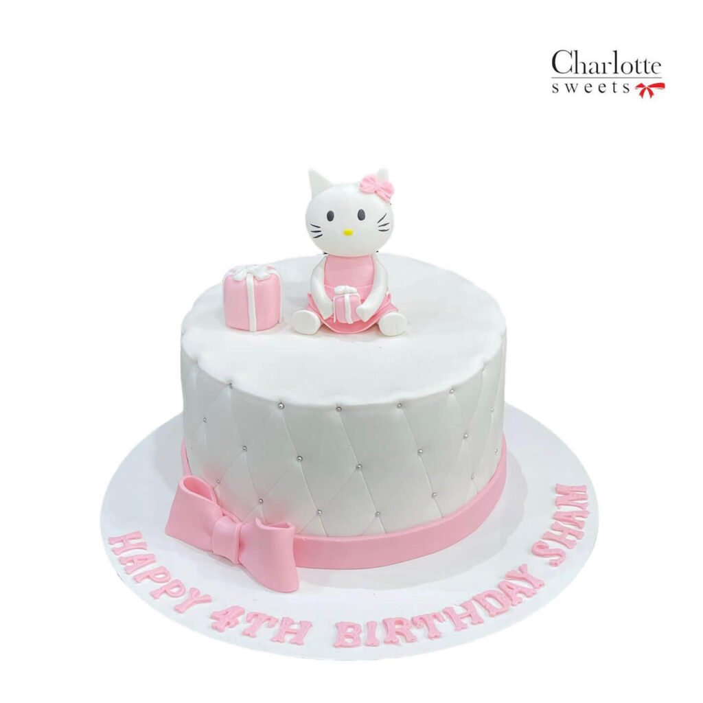 This adorable cake is a dream come true for any Hello Kitty fan! The cake features a charming 3D Hello Kitty figurine sitting with a present, creating a whimsical and heartwarming scene. The cake is further embellished with a quilted white frosting and a delicate pink ribbon, adding a touch of elegance. The inscription “Happy 4th Birthday Shayla” completes this sweet and personalized treat. Order online for next-day delivery in Dubai, Sharjah, and Ajman.