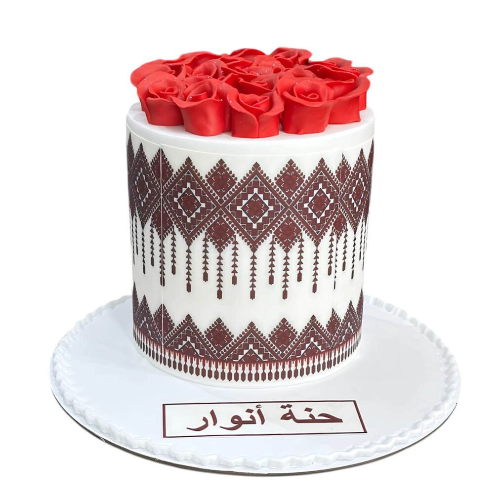 Celebrate with our Henna Cake, featuring a white fondant base wrapped in intricate red geometric patterns inspired by traditional embroidery. The cake is topped with handcrafted red roses and includes a personalized Arabic message for the henna celebration. A meaningful and artistic centerpiece for pre-wedding festivities and cultural gatherings. Order now for next-day delivery in Dubai, Sharjah, and Ajman.