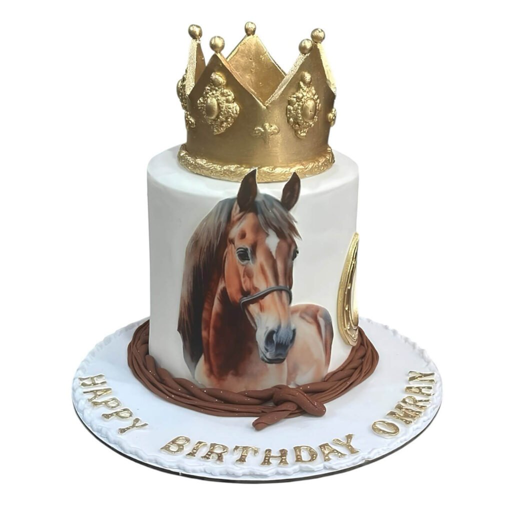 Celebrate with our Horse Theme Cake, featuring a white fondant base with a realistic horse illustration, golden horseshoe, and braided rope detail. The cake is crowned with a regal gold topper and personalized birthday message. A majestic centerpiece for horse lovers and equestrian-themed celebrations. Order now for next-day delivery in Dubai, Sharjah, and Ajman.