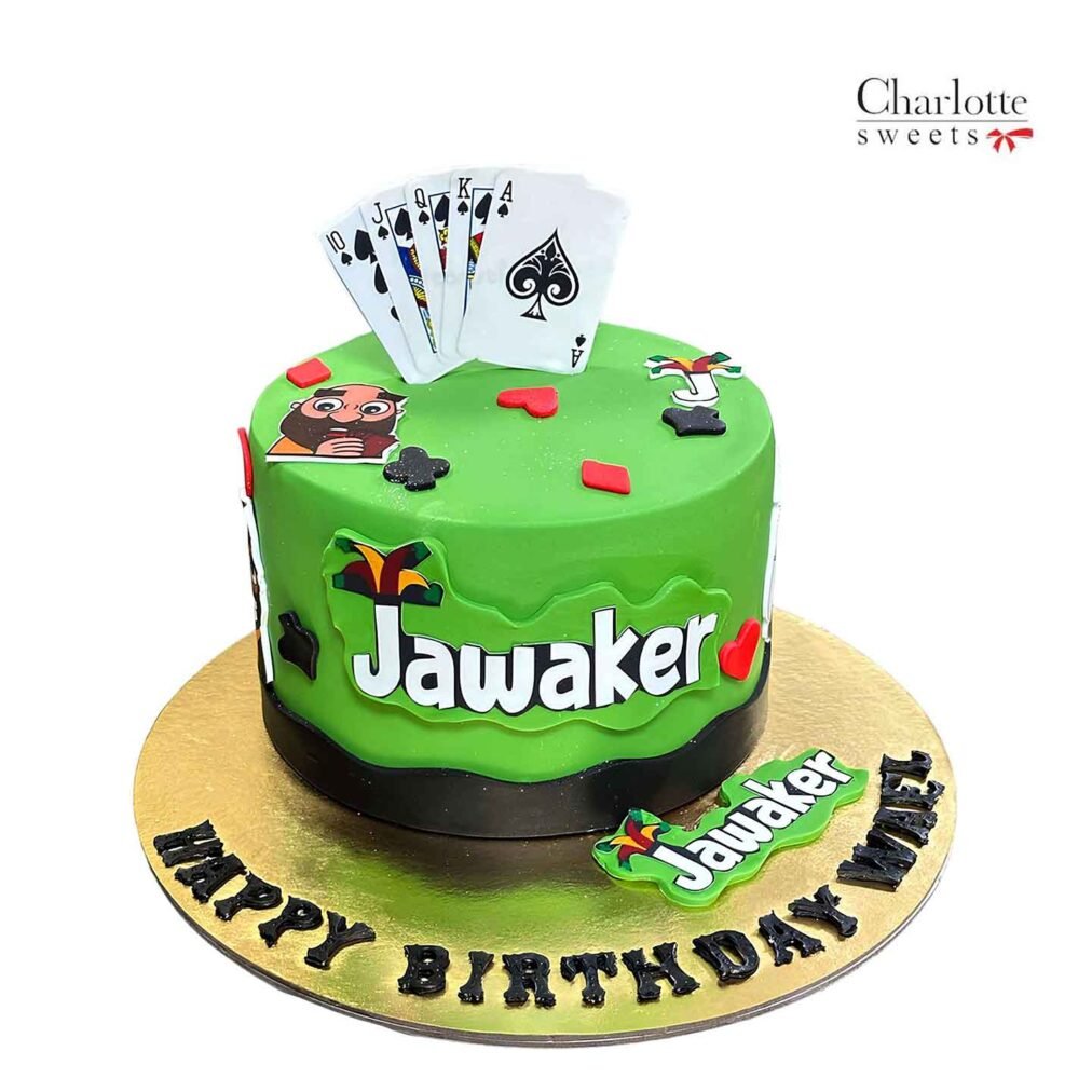 This cake is themed around the Jawaker online card game, featuring a green base with card suit decorations and a fan of playing cards. It includes the Jawaker logo in white lettering and the message “HAPPY BIRTHDAY WIEL” in black lettering. The cake is set on a gold base. Order online for next-day delivery in Dubai, Sharjah, and Ajman.