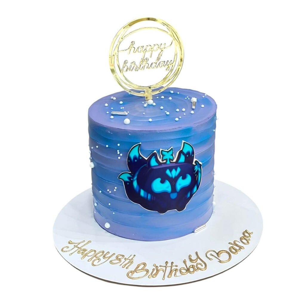 Celebrate with our Kitsune Cake, featuring a smooth blue‑to‑purple gradient base, shimmering sprinkles, silver beads, and a striking Kitsune character topper with glowing blue details. A mystical and personalized centerpiece for fans of fantasy creatures and magical birthday themes. Order now for next-day delivery in Dubai, Sharjah, and Ajman.