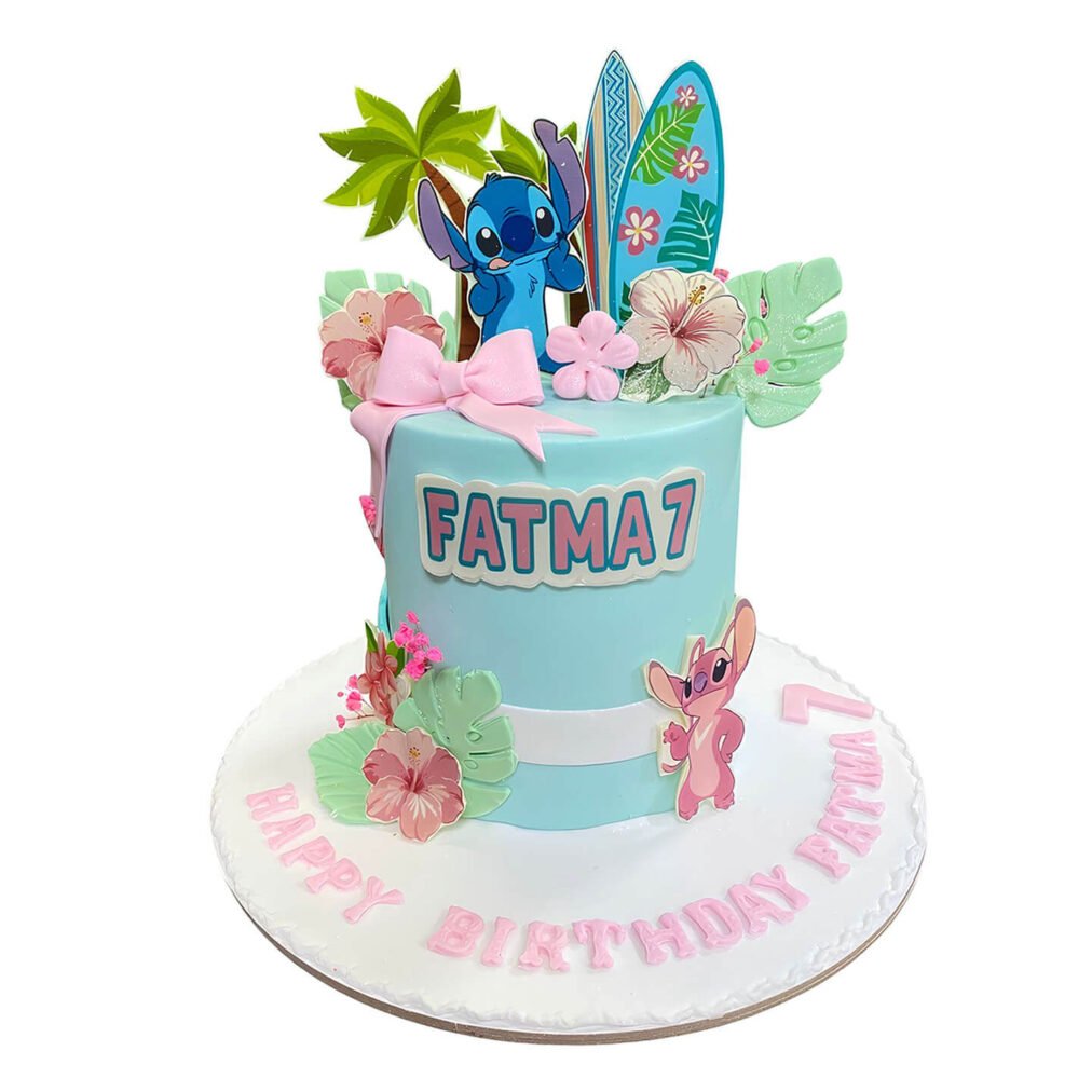 Celebrate with our Lilo & Stitch Birthday Cake, featuring a light blue base with tropical leaves, surfboards, hibiscus flowers, and fondant Stitch and Angel toppers. The cake includes a bold number “7” and personalized name for a vibrant beach vibe. A cheerful and playful centerpiece for fans of the animated duo and Hawaiian-themed birthdays. Order now for next-day delivery in Dubai, Sharjah, and Ajman.
