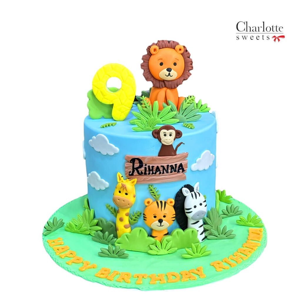 Celebrate with this delightful jungle-themed cake! This single-tier cake features a soft blue base, adorned with playful fondant animals including a lion, giraffe, tiger, zebra, and monkey, bringing the jungle to life. The cake is further embellished with fondant leaves and clouds, enhancing the whimsical theme. Rihanna’s name is prominently displayed in a cursive font, adding a personalized touch. A bright yellow “9” topper marks the special age. “HAPPY BIRTHDAY RIHANNA” is inscribed on the cake board. Order online for next-day delivery in Dubai, Sharjah, and Ajman.