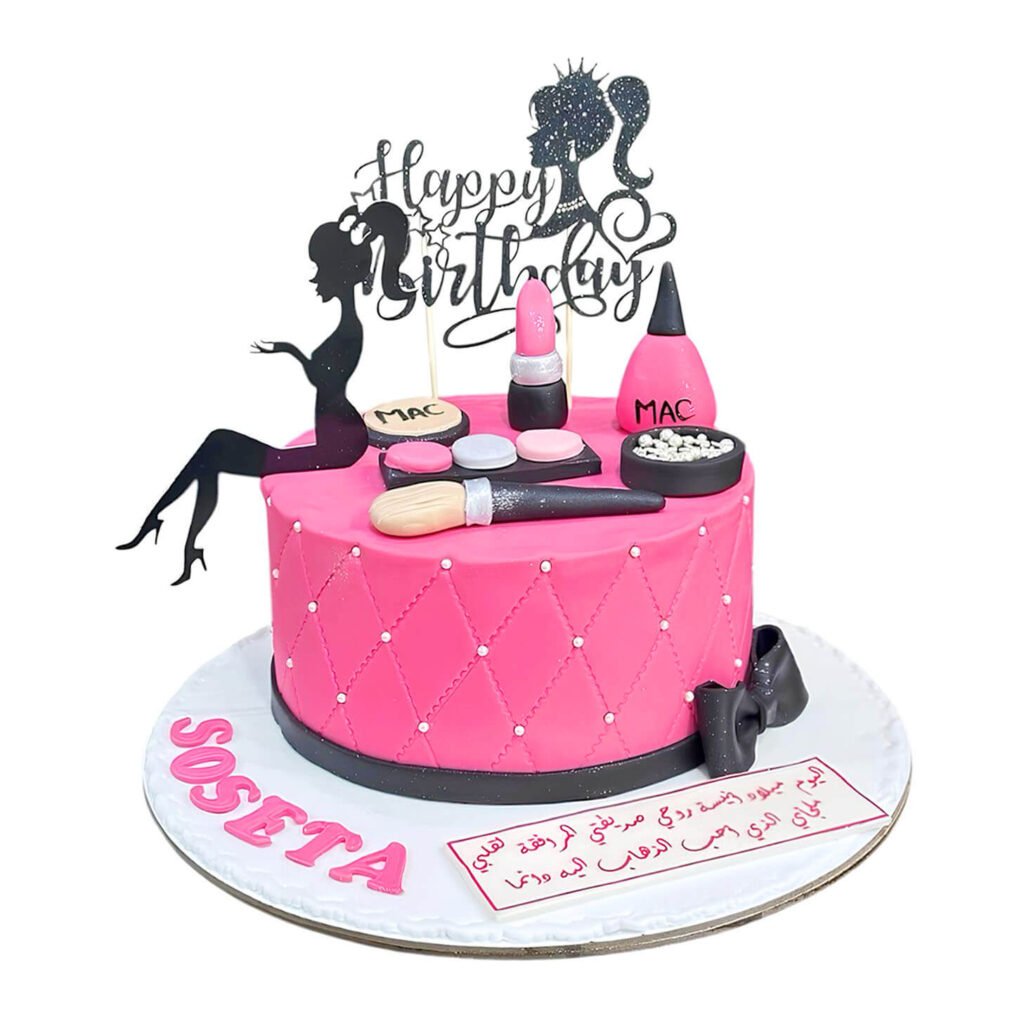 Celebrate with our MAC Cake, featuring a pink quilted fondant base accented with white pearls and topped with realistic fondant makeup items. The design includes MAC-branded lipstick, nail polish, eyeshadow palette, powder compact, and brush. Black silhouette toppers and a heartfelt Arabic message add elegance and personality. Order now for next-day delivery in Dubai, Sharjah, and Ajman.