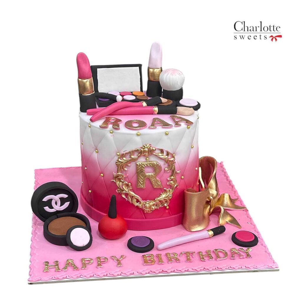 Celebrate with our Makeup Designer Cake, featuring a stunning pink and white base with gold accents. The top is adorned with realistic fondant makeup items, including lipsticks, a makeup brush, an eyeshadow palette, and a powder puff. The side of the cake displays the word “ROAR” in gold letters and a gold emblem with the letter “R” in the center. The base is decorated with additional makeup items, such as a compact with the Chanel logo, a nail polish bottle, and more makeup brushes. Order now for next-day delivery in Dubai, Sharjah, and Ajman.