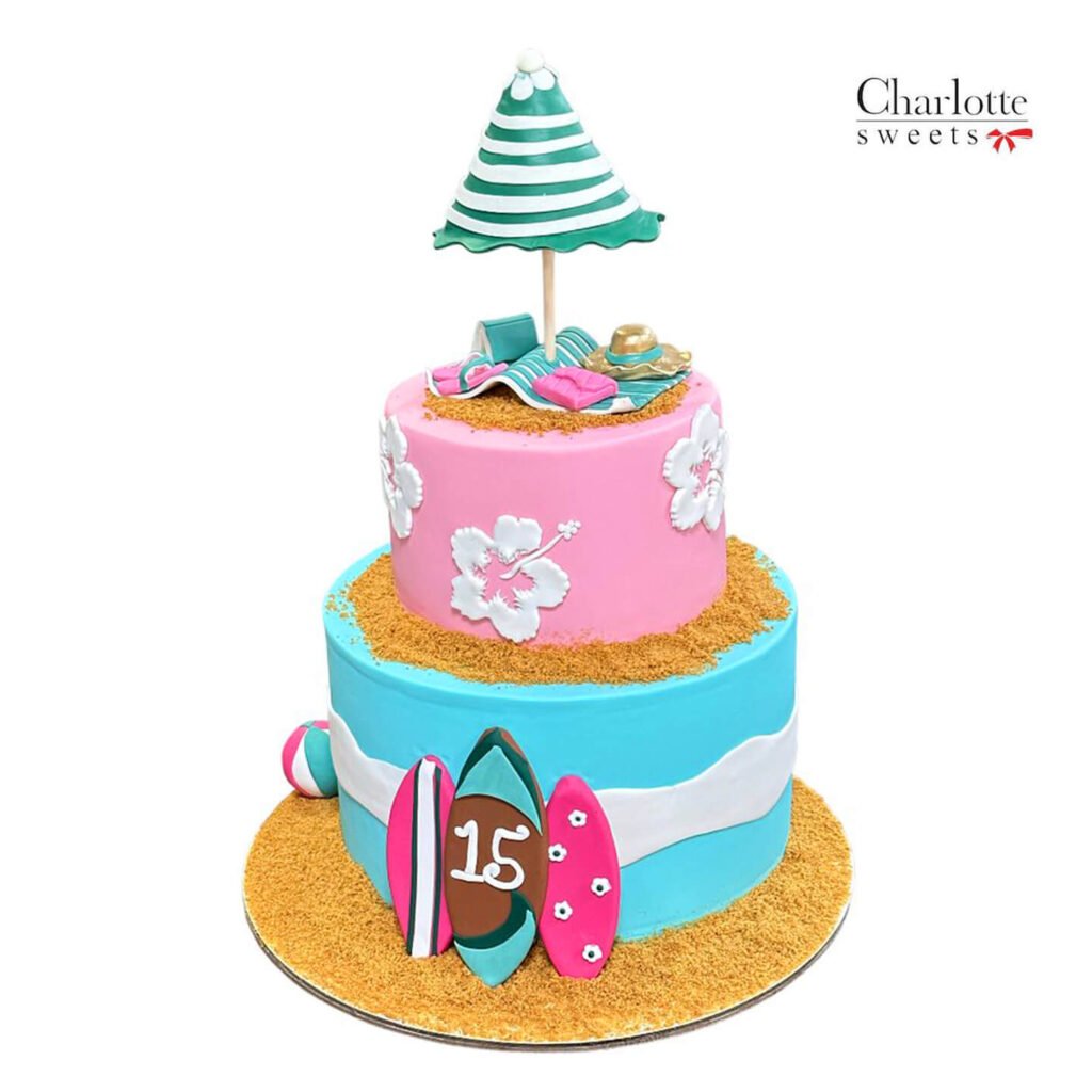 Celebrate with this vibrant Malibu beach party cake! This two-tiered cake features a beachy design with a sandy base and blue waves on the bottom tier, complemented by pink and white hibiscus flowers on the top. The cake is adorned with surfboards, a beach ball, and a striped parasol, creating a fun and summery atmosphere. A “15” is featured on one of the surfboards, marking the special age. This cake is a perfect centerpiece for a beach-themed celebration. Order online for next-day delivery in Dubai, Sharjah, and Ajman.