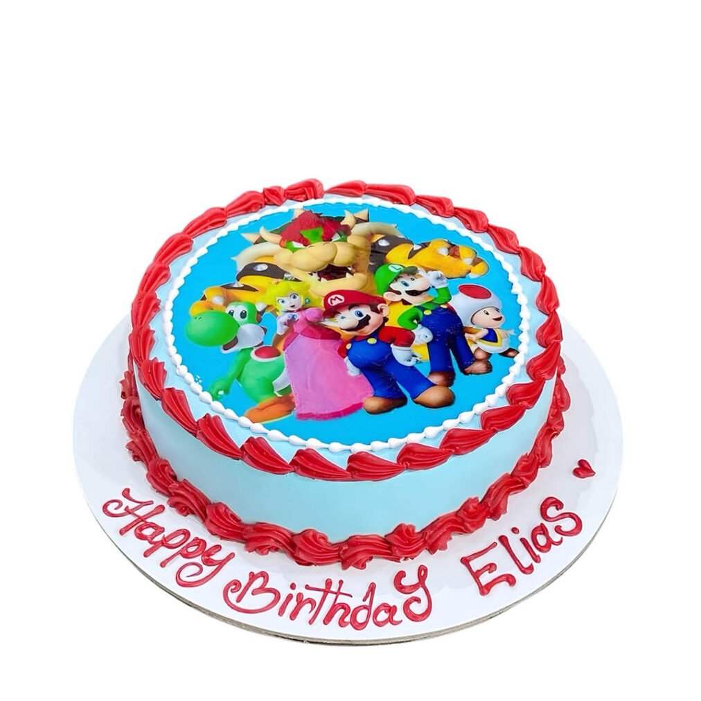 Celebrate with our Mario Photo Cake, featuring a round base with red frosting borders and a vibrant edible image of Mario, Luigi, Princess Peach, Yoshi, Donkey Kong, and more. A fun and personalized centerpiece for Super Mario fans and gaming-themed birthday parties. Order now for next-day delivery in Dubai, Sharjah, and Ajman.