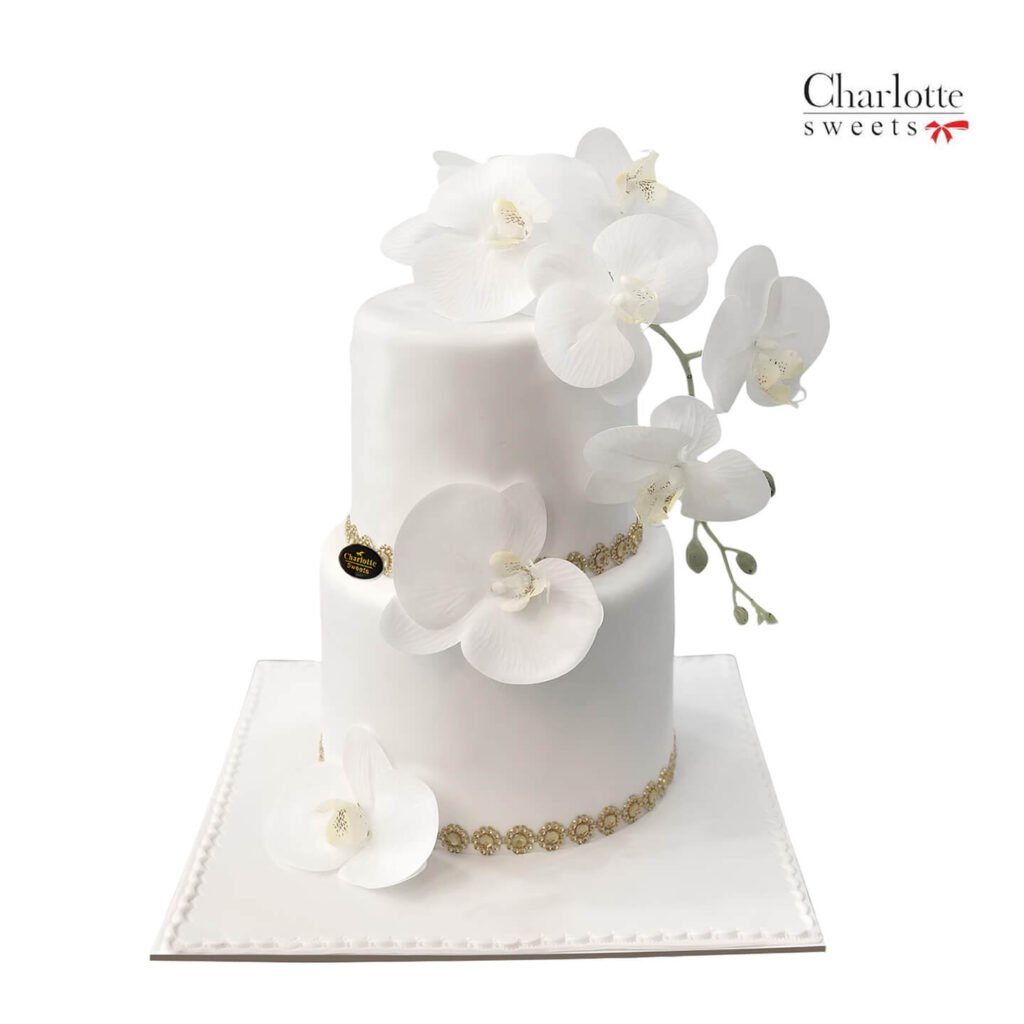 This cake is perfect for wedding party, anniversary, or a special engagement occasion. elegant two-tiered cake is a masterpiece of simplicity and sophistication. The pristine white tiers are adorned with a graceful arrangement of delicate white orchids, creating a picture of pure elegance. Order online for next-day delivery in Dubai, Sharjah, and Ajman.