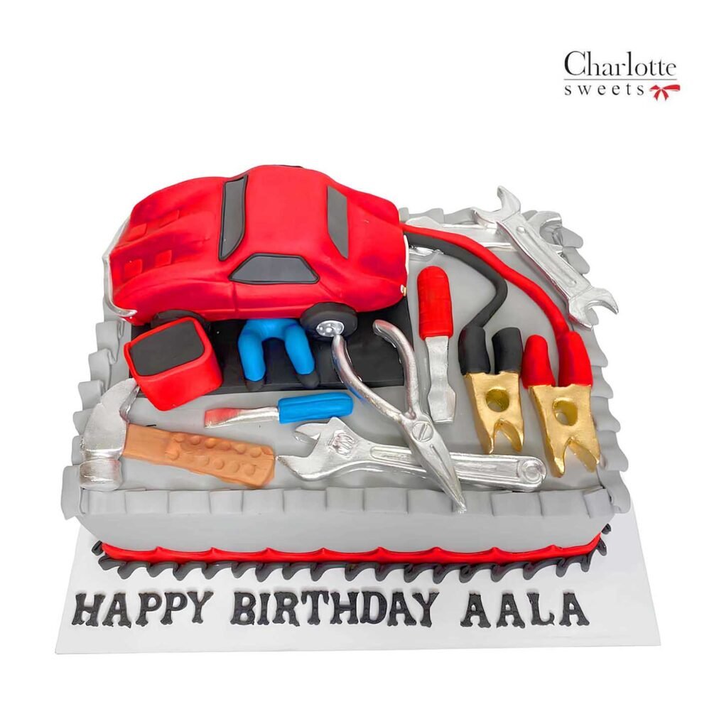 This is a rectangular cake designed with a car repair or mechanic theme, featuring a red toy car and various “tools” made from fondant, such as wrenches, pliers, a hammer, and screwdrivers. The cake includes red and gray details, and the message “HAPPY BIRTHDAY AALA” is written in black lettering. The base is white. Order online for next-day delivery in Dubai, Sharjah, and Ajman.