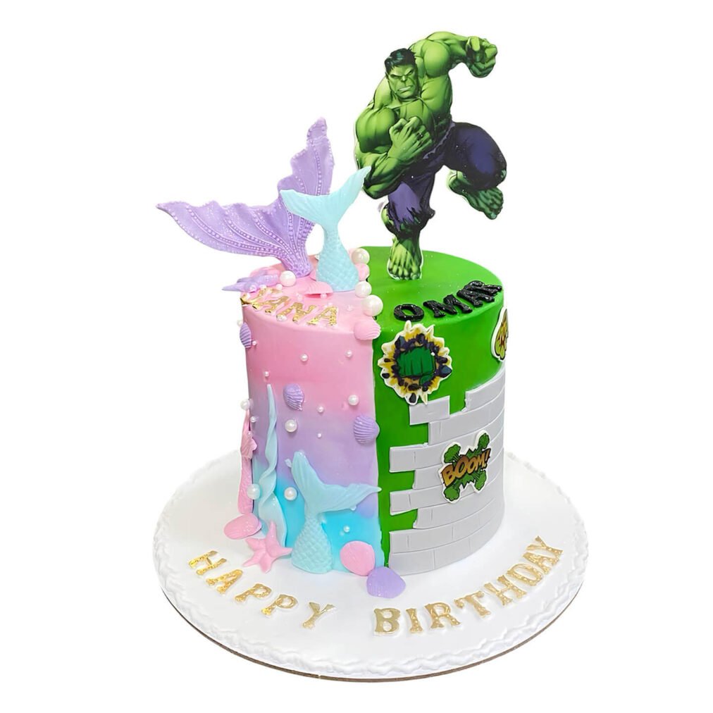 Order your Mermaid and Hulk Cake today for next-day delivery in Dubai, Sharjah, and Ajman, and make their celebration unforgettable with two themes in one!