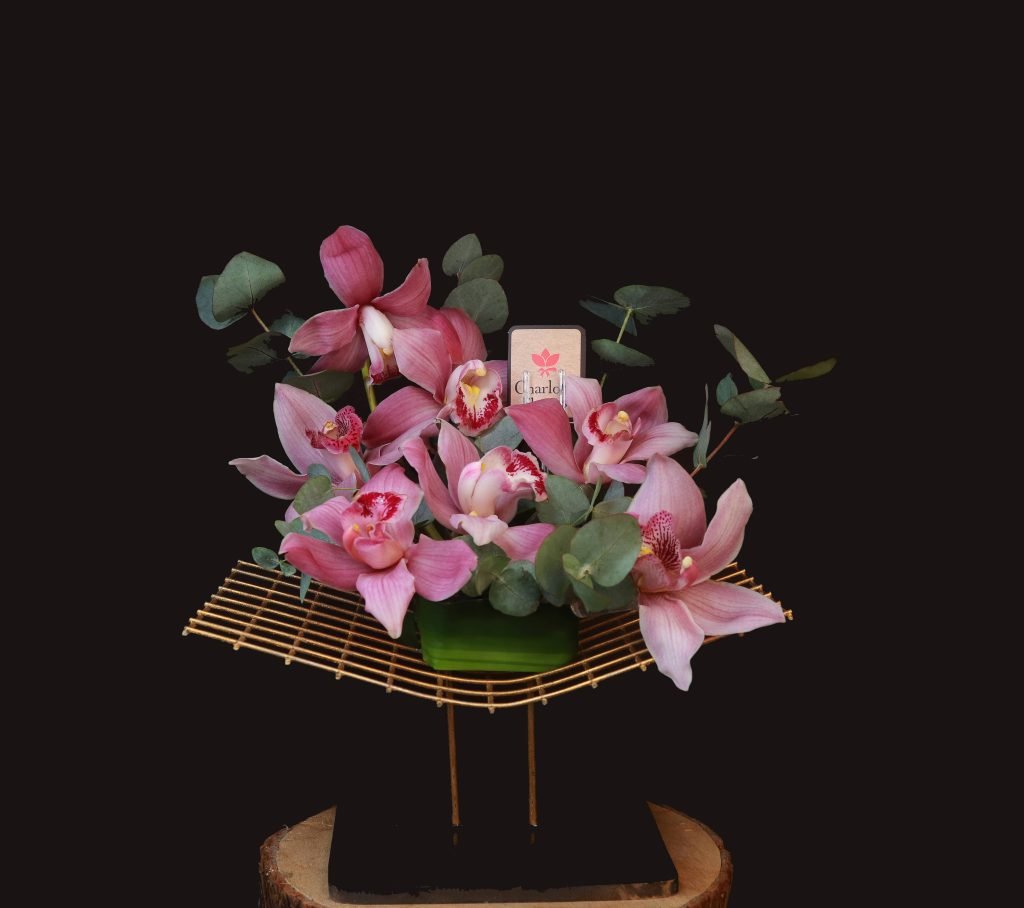 Indulge in the beauty of this modern orchid arrangement, featuring a stunning cascade of pink orchids with eucalyptus leaves. Presented in a stylish gold-toned wire stand, this unique gift is perfect for birthdays, anniversaries, or any special occasion. Order online for next-day delivery in Dubai, Sharjah, and Ajman.