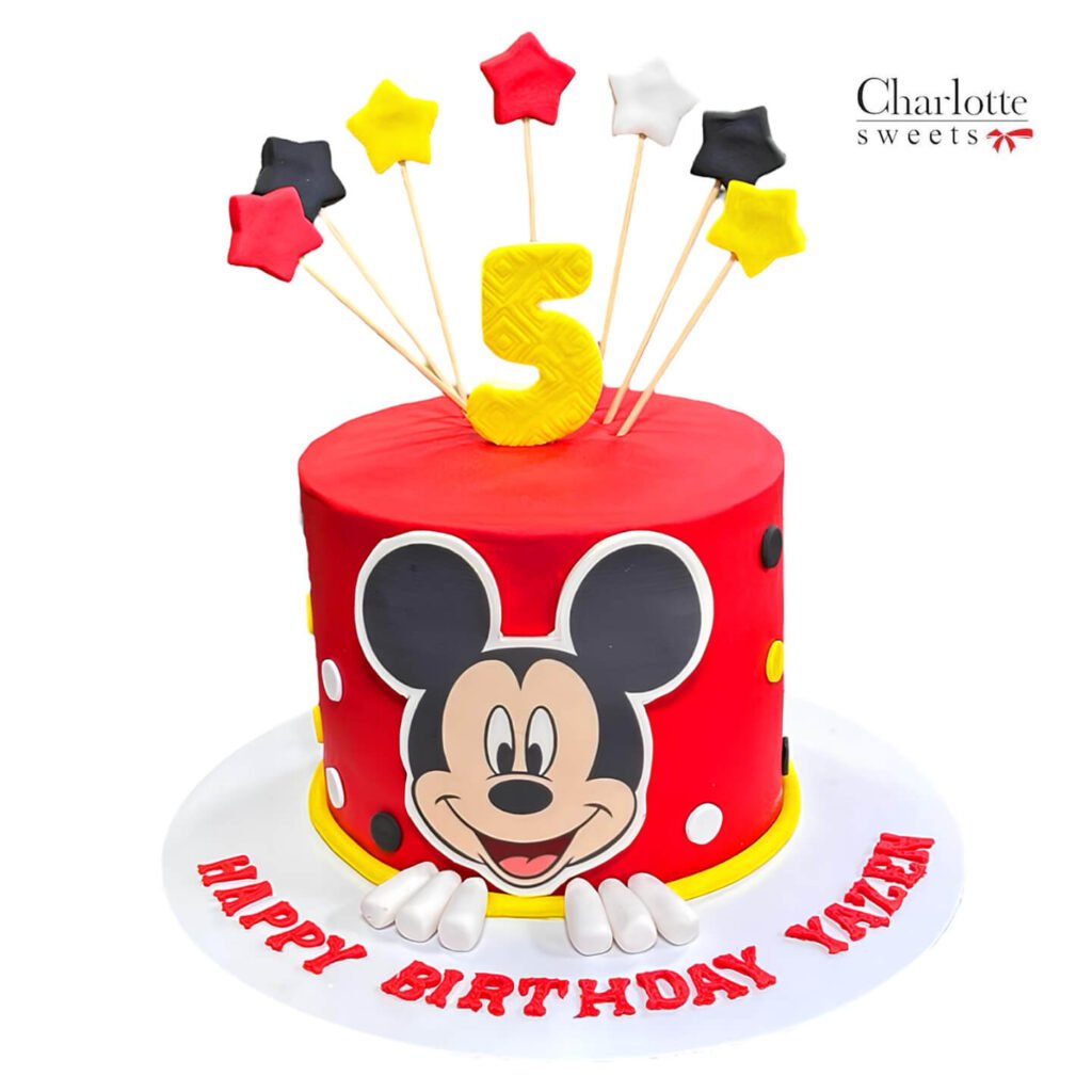 Celebrate Your birthday with this vibrant Mickey Mouse cake! This single-tier cake features a bright red base, showcasing a cheerful Mickey Mouse face with his iconic ears and white gloves. Yellow and black polka dots add a playful touch. A yellow “5” topper stands tall, surrounded by colorful star-shaped decorations. “HAPPY BIRTHDAY YAZEN” is inscribed on the cake board. Order online for next-day delivery in Dubai, Sharjah, and Ajman.