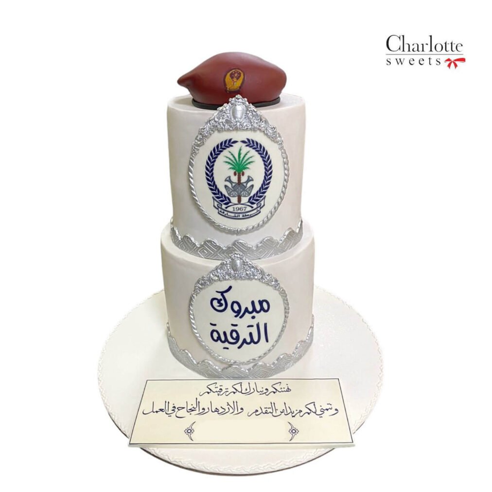 This two-tiered cake celebrates a promotion within the Saudi Armed Forces, featuring a light base with the Saudi Arabian emblem and a maroon beret on top. It includes a plaque with the Arabic phrase (Congratulations on the promotion) and a message wishing for further progress and success. The cake is set on a white base. Order online for next-day delivery in Dubai, Sharjah, and Ajman.