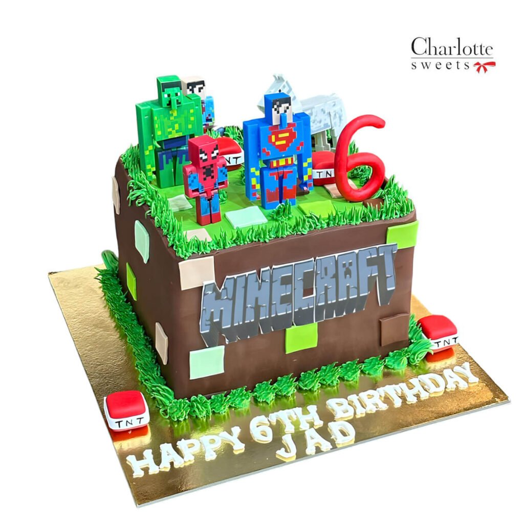 Celebrate Jad’s 6th birthday with this adventurous Minecraft-themed cake! This square cake features a design inspired by the popular video game, with pixelated blocks and grassy terrain, bringing the virtual world to life. Minecraft character figurines, including a superhero and a spider, stand proudly on the cake. TNT blocks add a playful touch, while the number “6” marks the milestone. The Minecraft logo is prominently displayed, and “HAPPY 6TH BIRTHDAY JAD” is scripted on the cake board, making it a personalized and exciting centerpiece for a young gamer’s celebration. Order online for next-day delivery in Dubai, Sharjah, and Ajman.