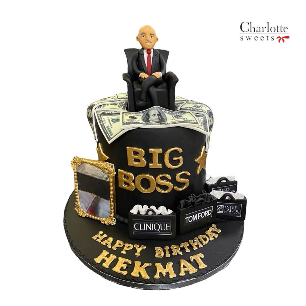 This cake features a “Big Boss” theme with a figurine sitting on a chair. It includes money decorations and brand name accents like Clinique and Tom Ford. The cake has a “BIG BOSS” banner and a picture frame. The base is scripted with “HAPPY BIRTHDAY .” This is a unique centerpiece for a celebration. Order online for next-day delivery in Dubai, Sharjah, and Ajman.