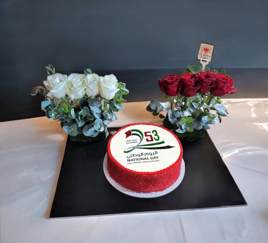 Celebrate UAE National Day with this stunning gift set featuring a beautiful flower Arrangement and a delicious red velvet cake with UAE flag colors. This exquisite gift set is the ideal way to express your love and appreciation for the UAE and its people. Order now and celebrate this special occasion in style!. delivery in Dubai, Sharjah, and Ajman!