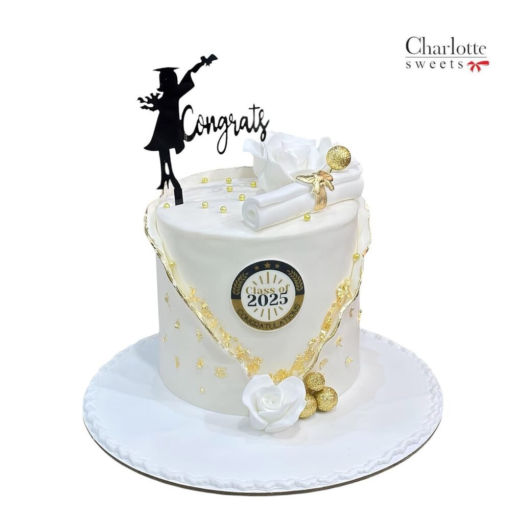 This round white cake is the perfect way to celebrate graduation milestones. It features gold accents, rolled diplomas tied with gold ribbons, and a black silhouette of a graduate holding a diploma. The design is completed with white roses, gold balls, and a circular emblem with “Class of 2025” and “Congratulations” written on it. making it an excellent centerpiece for graduation parties. Order online for next-day delivery in Dubai, Sharjah, and Ajman.