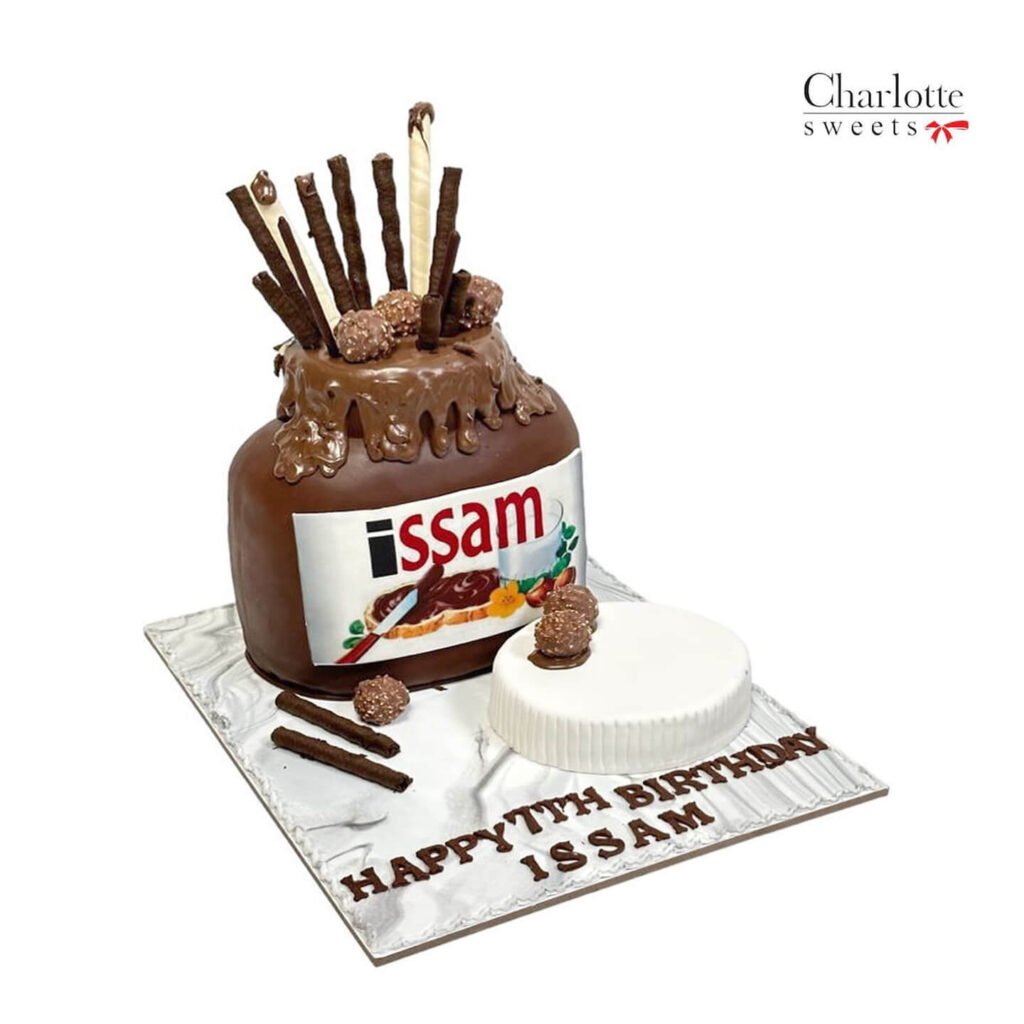 This playful birthday cake is a delightful tribute to a beloved chocolate hazelnut spread. Shaped like a jar of Nutella, the cake features a rich chocolate frosting with a drip effect, capturing the iconic look. The name “Issam” is prominently displayed on the “label,” adding a personalized touch. Chocolate sticks and hazelnut chocolates adorn the top, creating a decadent and textural experience. A separate white cake base with ribbed detailing sits alongside, adding a unique element. The silver cake board is inscribed with “HAPPYTTH BIRTHDAY ISSAM,” making it a fun and memorable celebration for a Nutella enthusiast. Order online for next-day delivery in Dubai, Sharjah, and Ajman.