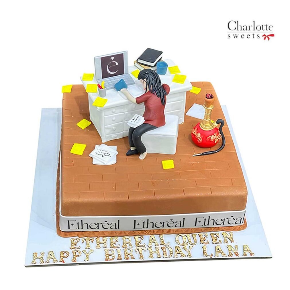 Celebrate with our Office Theme Cake, featuring a detailed design of an office desk setup. The cake includes a fondant figure sitting at a desk with a computer, books, and scattered papers. A hookah is placed beside the desk, adding a unique touch. The desk is complete with drawers, and the cake is decorated with yellow sticky notes. while the base includes the personalized message “ETHEREAL QUEEN HAPPY BIRTHDAY LANA” written in gold letters. This cake is a perfect centerpiece for a professional or office-themed celebration. Order now for next-day delivery in Dubai, Sharjah, and Ajman.