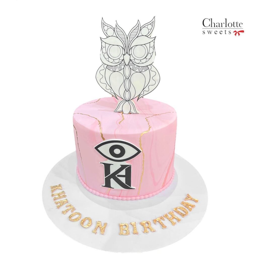 This cake features a captivating owl theme. The centerpiece is a beautifully detailed owl figurine perched atop the cake. The cake is a soft pink with gold accents. A stylized eye design and the letter “K” add to the visual appeal. The base is white with “KHATOON BIRTHDAY” in gold script. This unique cake is perfect for a celebration. Order online for next-day delivery in Dubai, Sharjah, and Ajman.