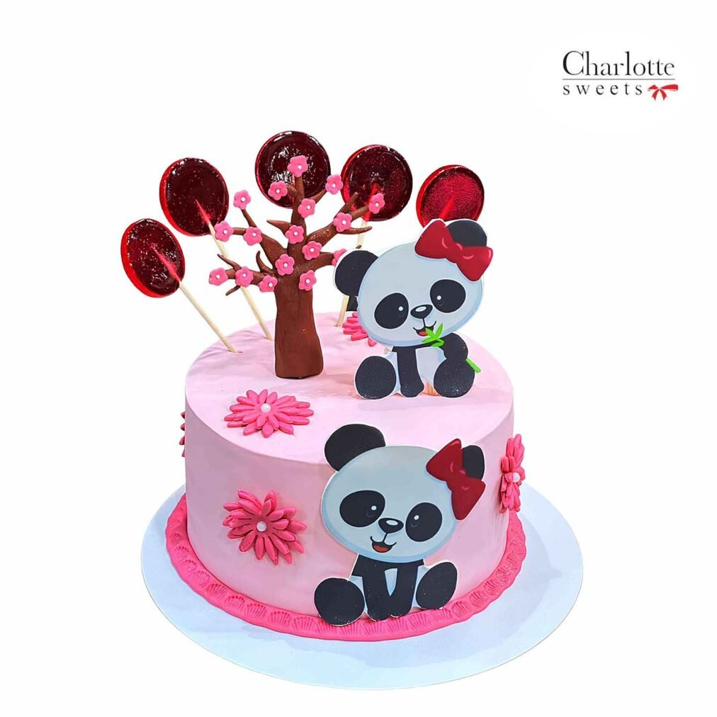 This cake features a charming panda theme with two adorable panda toppers, each wearing a red bow. The cake is adorned with pink flowers and a brown tree with red candy “leaves.” The cake itself is a light pink color, and the base is trimmed with a darker pink border. This cake is a sweet and whimsical centerpiece for a celebration. Order online for next-day delivery in Dubai, Sharjah, and Ajman.