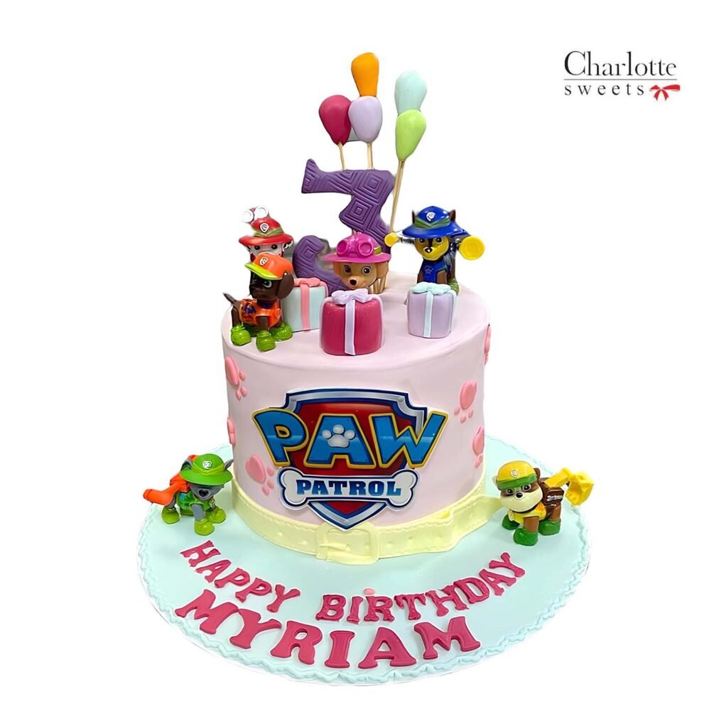 This is a cake themed around Paw Patrol, featuring a light pink fondant covering with the Paw Patrol logo and character figurines. The cake includes a “3” numeral topper, balloon decorations, and the message “HAPPY BIRTHDAY MYRIAM” in pink lettering. Order online for next-day delivery in Dubai, Sharjah, and Ajman.