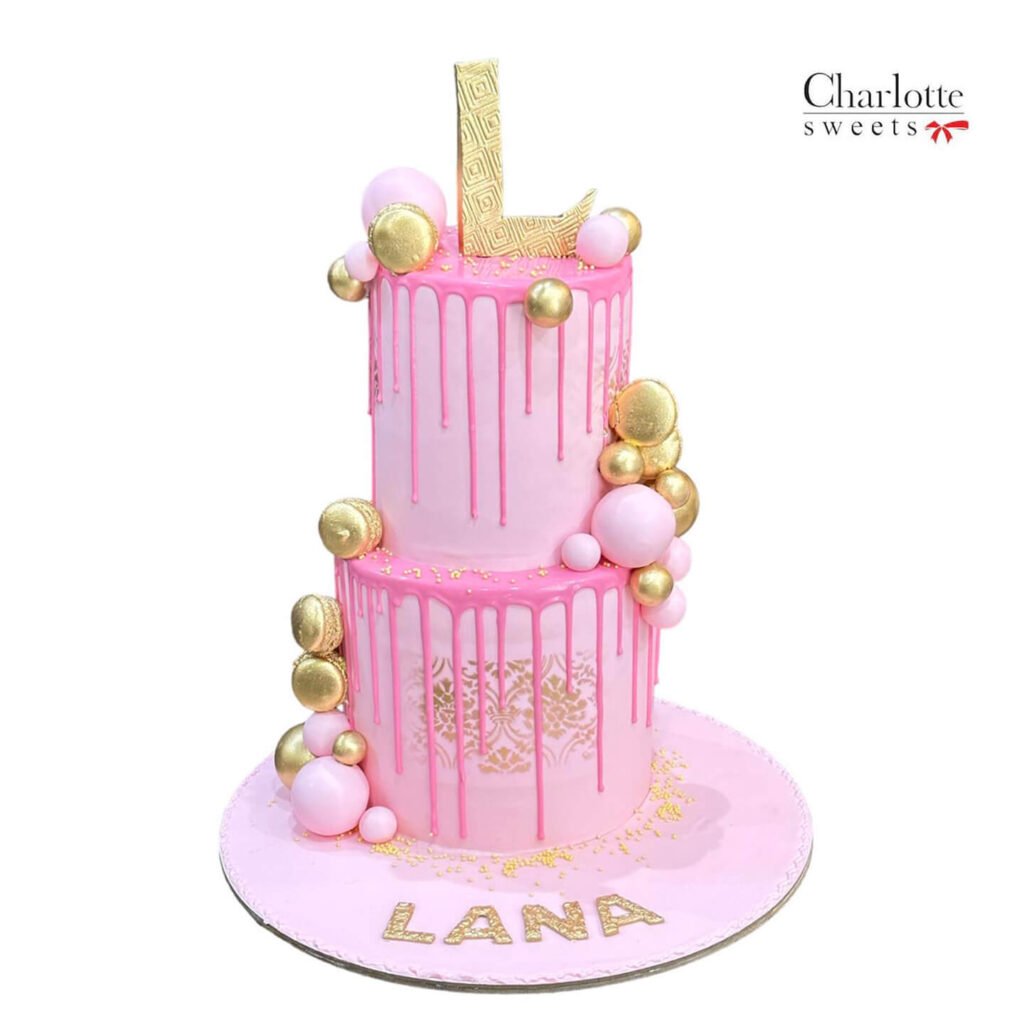 This elegant two-tiered cake is a masterpiece of design! It features a captivating combination of pink and gold, with a stunning drip effect and a playful arrangement of bubbles. Perfect for birthdays, baby showers, or any special occasion. Order online for next-day delivery in Dubai, Sharjah, and Ajman.