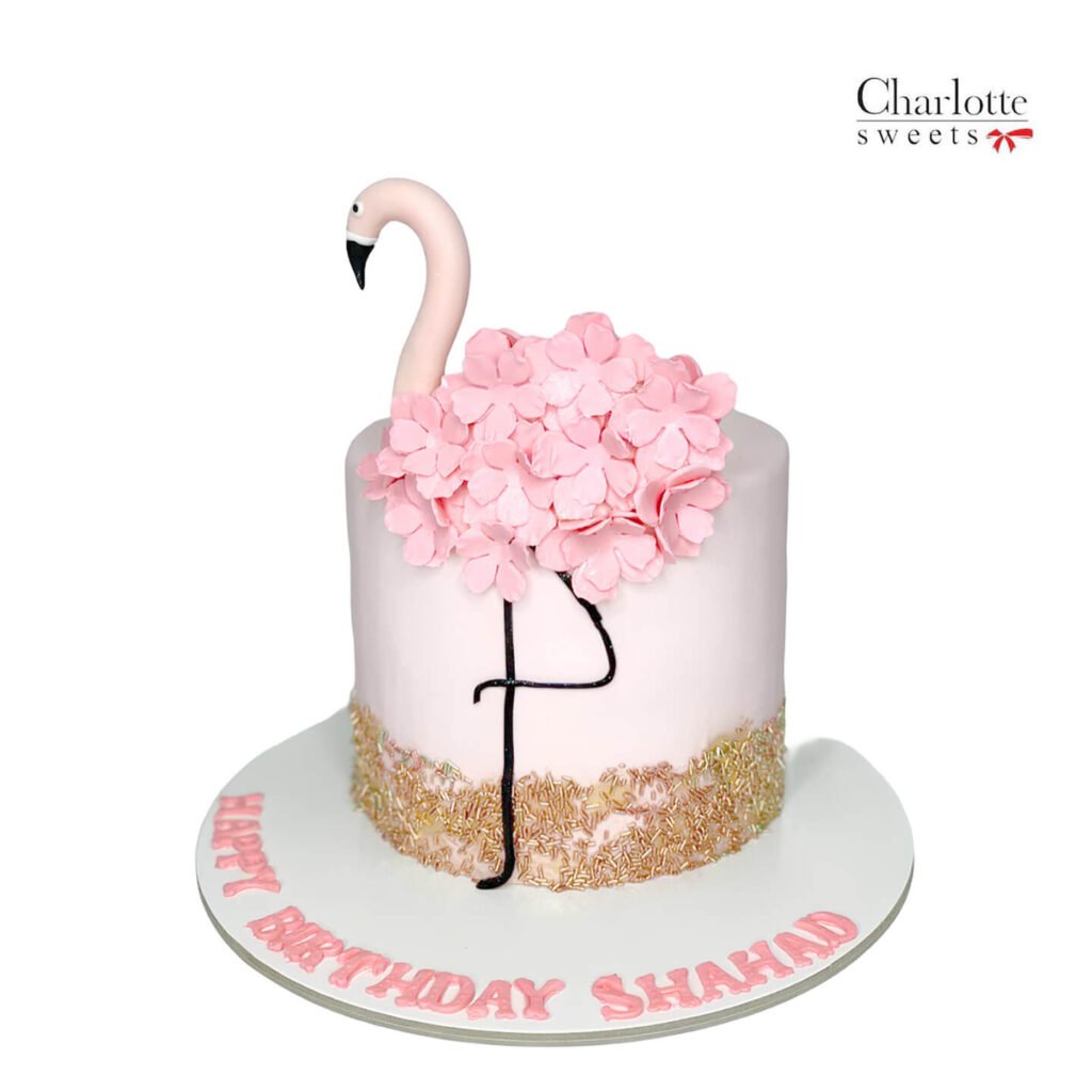 This adorable cake is perfect for a summer birthday or a tropical-themed celebration! The cake features a charming pink flamingo standing tall, adorned with delicate sugar flowers. The base of the cake is decorated with gold sprinkles, adding a touch of elegance. The inscription “Happy Birthday Shahad” completes this sweet and whimsical treat. Order online for next-day delivery in Dubai, Sharjah, and Ajman.
