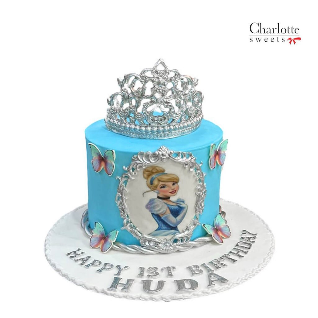 This enchanting Cinderella-themed cake is the perfect way to celebrate a little girl’s special day. The cake features a beautiful image of Cinderella, surrounded by delicate butterflies and a sparkling silver crown. The personalized message “Happy 1st Birthday Huda” adds a special touch. Order online for next-day delivery in Dubai, Sharjah, and Ajman.