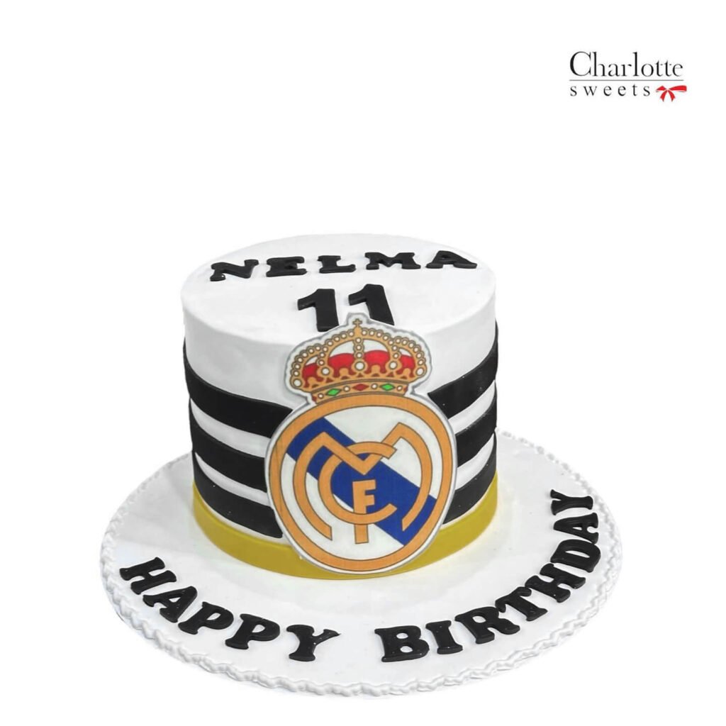 Add a special touch to your celebration by customizing your Real Madrid Football Cake with the recipient’s name, making it truly memorable.